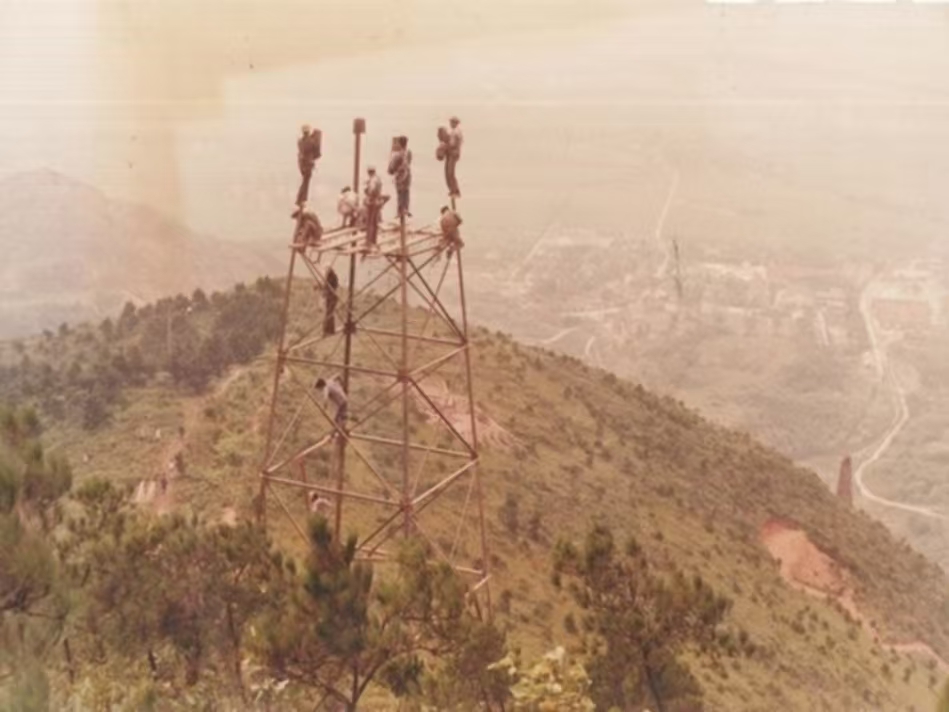 地质四队在观山矿区开展地质勘探,上图为工人安装钻塔 吴县东渚小茅山多金属矿详勘工区,夜间钻探施工