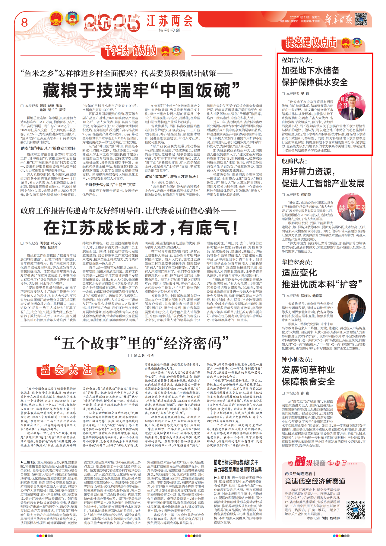 1月21日,《新华日报》、交汇点报道江苏省人大代表,江苏省地质局党委书记、局长程知言关于加强我省地下水资源储备与保护的建议。