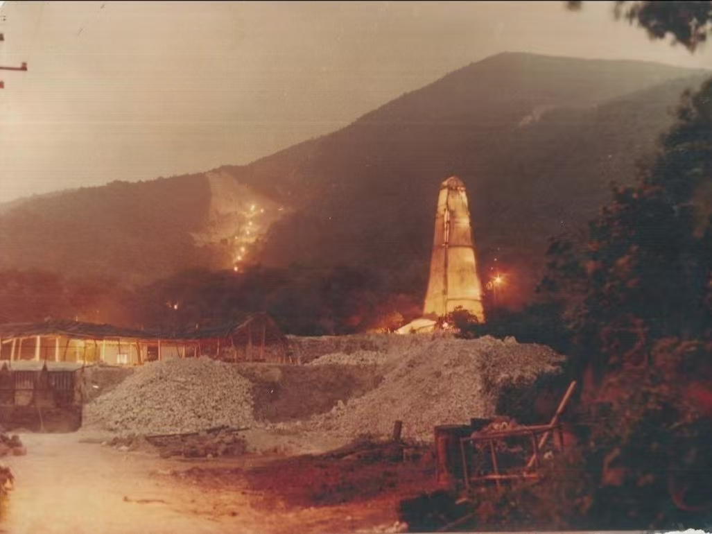 地质四队在观山矿区开展地质勘探,上图为工人安装钻塔 吴县东渚小茅山多金属矿详勘工区,夜间钻探施工