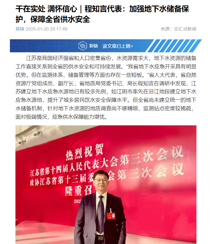 1月21日,《新华日报》、交汇点报道江苏省人大代表,江苏省地质局党委书记、局长程知言关于加强我省地下水资源储备与保护的建议。